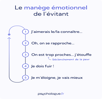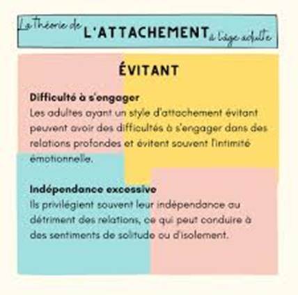 Ces exemples montrent comment l’attachement évitant influence la manière dont une personne se comporte dans ses relations, souvent en privilégiant la distance et l’autonomie au détriment de la proximité émotionnelle.